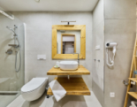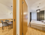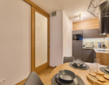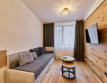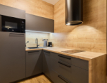 Apartmán je řešen moderním stylem s důrazem na design. Dispozice apartmánu je 2+kk s celkovou podlahovou plochou (vč. Bike boxu 1,90m2) 43,20m2. Vstupní předsíň je vybavena prostornou vestavěnou skříní, poskytující dostatek úložného prostoru. Po pravé straně je umístěna moderní koupelna se sprchovým koutem a WC. Následuje ložnice s manželskou postelí pro klidný spánek a komodou. Za posuvnými dveřmi je umístěna obývací místnost s rozkládací sedačkou a kuchyňským koutem s jídelnou. Kuchyňská linka je zařízena spotřebiči, ale také nádobím. Můžete tedy přijet a hned si apartmán užívat.