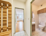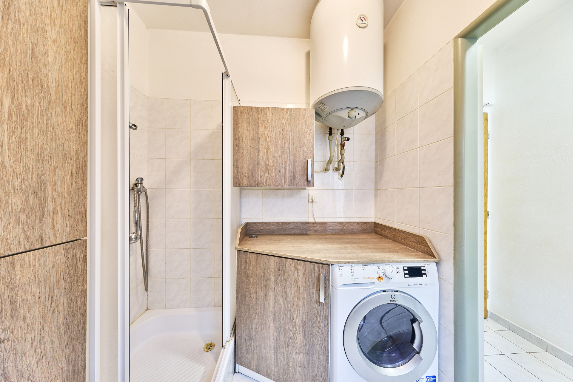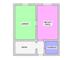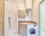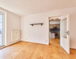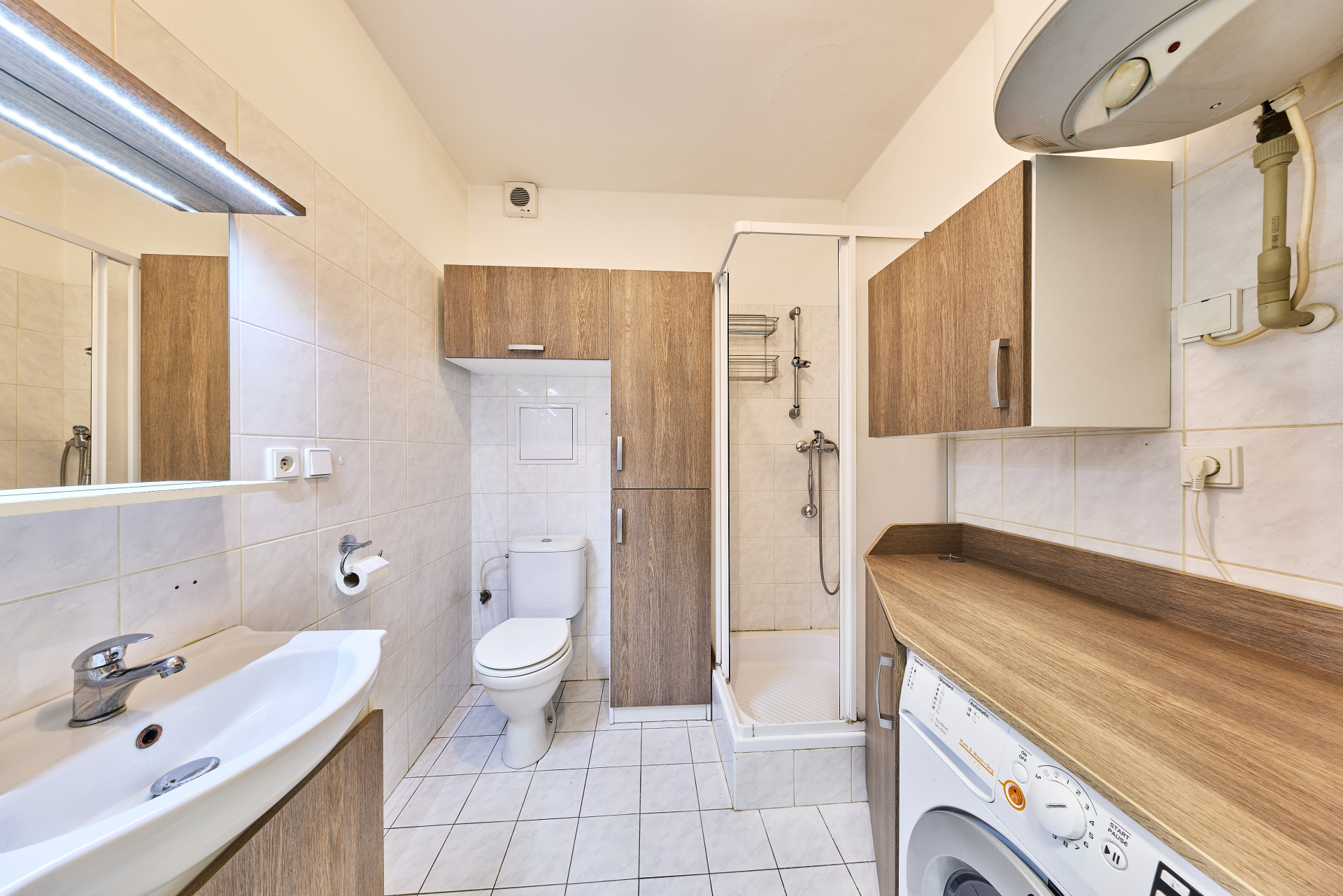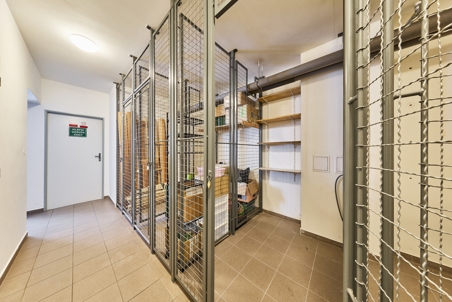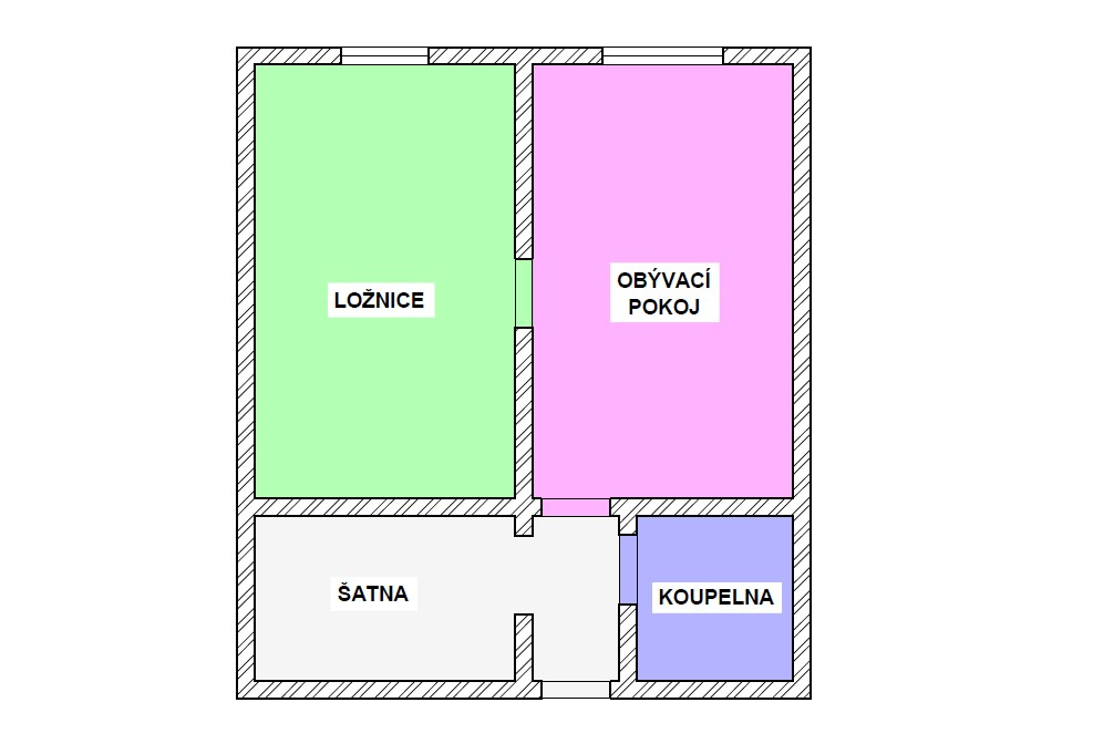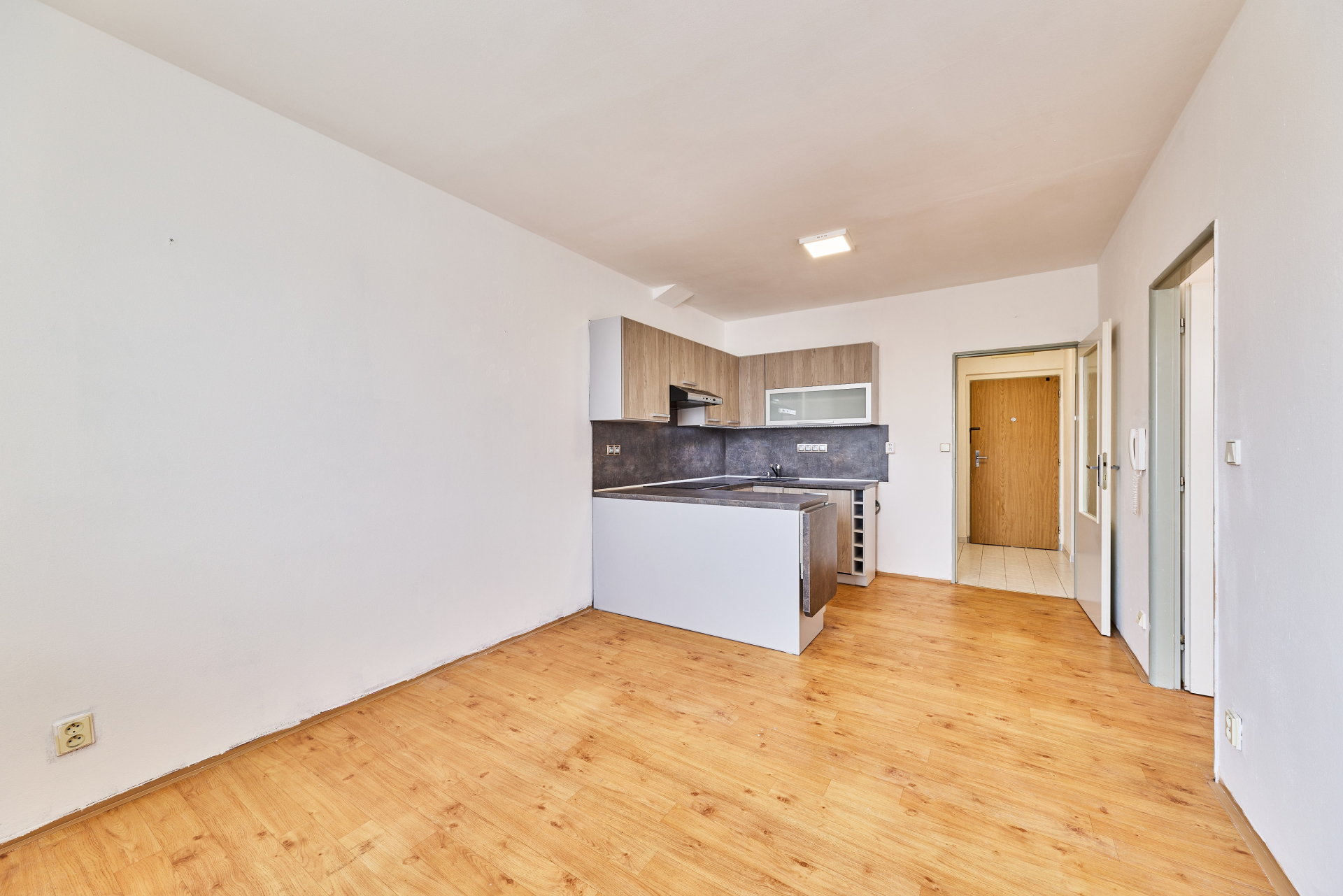 Dispozice: Vstupní předsíň (4,3 m2) s praktickými vestavěnými skříněmi, po pravé straně jsou dveře do koupelny (3,9 m2). Rovně je obývací pokoj s kuchyňským koutem (17,4 m2), ze kterého je vstup do ložnice (18,1 m2). V ložnici je francouzské okno se zábradlím.