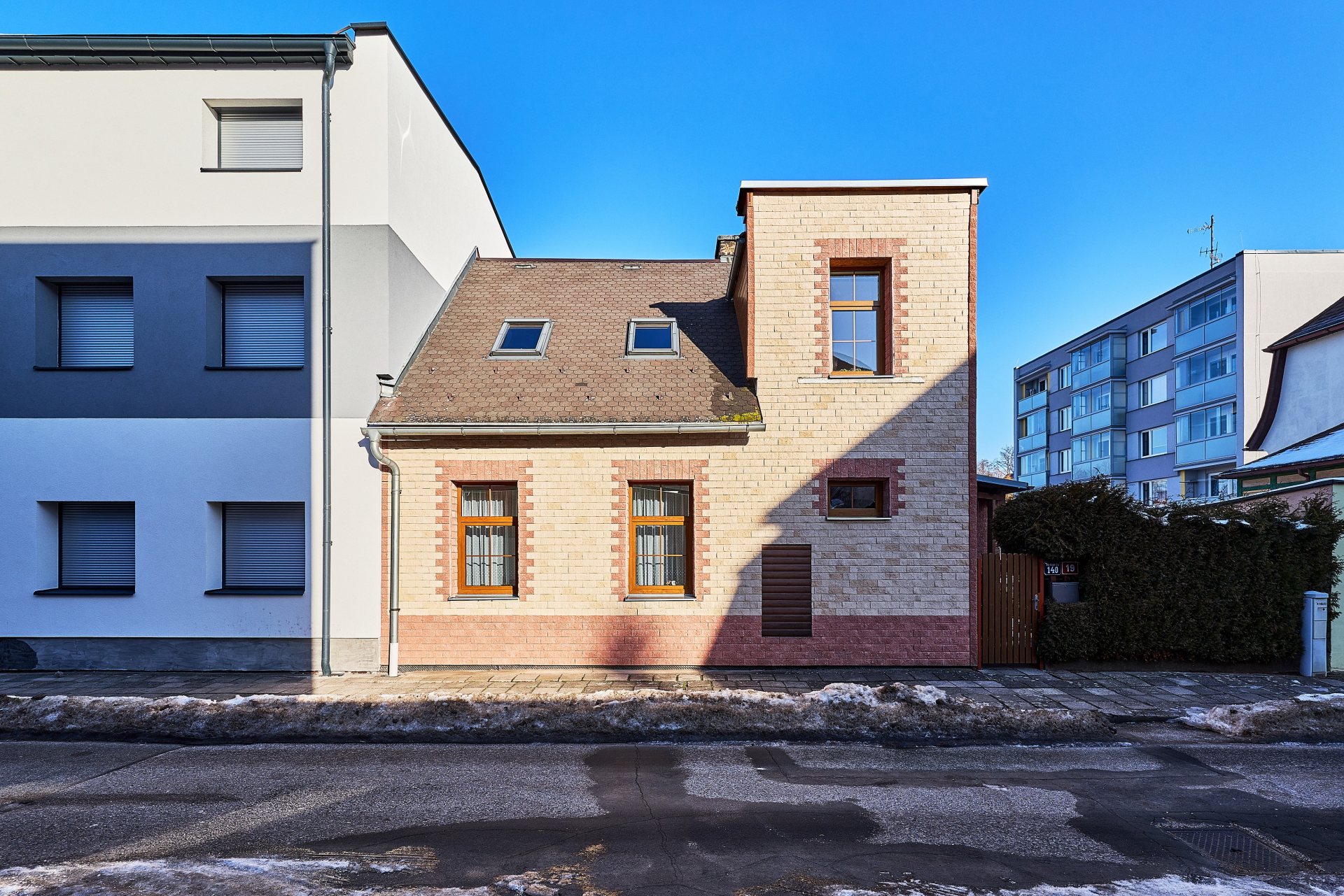 Rodinný dům je postaven jako zděná cihlová stavba nepravidelného půdorysu o dvou nadzemních podlažích a menším sklepem. Dům zakrývá klasická střešní konstrukce z dřevěných krokví, která je doplněna dvěma arkýři do ulice a do zahrady. Stropní konstrukce jsou dřevěné trámové. V domě jsou částečně zrekonstruovány podlahy – částečně jsou betonové a částečně původní prkenné na klasickém zásypu. Střešní krytina byla rekonstruována v roce 2000, kdy byla předchozími majiteli vyměněna severní část střechy – asfaltové pásy, jižní část střechy již rekonstruovali současní majitelé v roce 2003. Na této straně střechy je instalována bonská šindel. Fasáda byla zhotovena jako provětrávaná systémem NOVABRICK – betonovým obkladem s imitací kamene, který nabízí skvělou kombinaci dlouhé životnosti, stálosti a moderního vzhledu. Provětrávaná fasáda zajišťuje navíc zdravější prostředí uvnitř samotného domu, jelikož spolehlivě zajišťuje, aby dům „dýchal“ a tím například minimalizuje riziko plísní. Fasáda domu není zateplená. Dům má funkční komín, v kuchyni jsou k dispozici malá kamna na dřevo, kterými je možno si přitopit či naladit atmosféru domova.