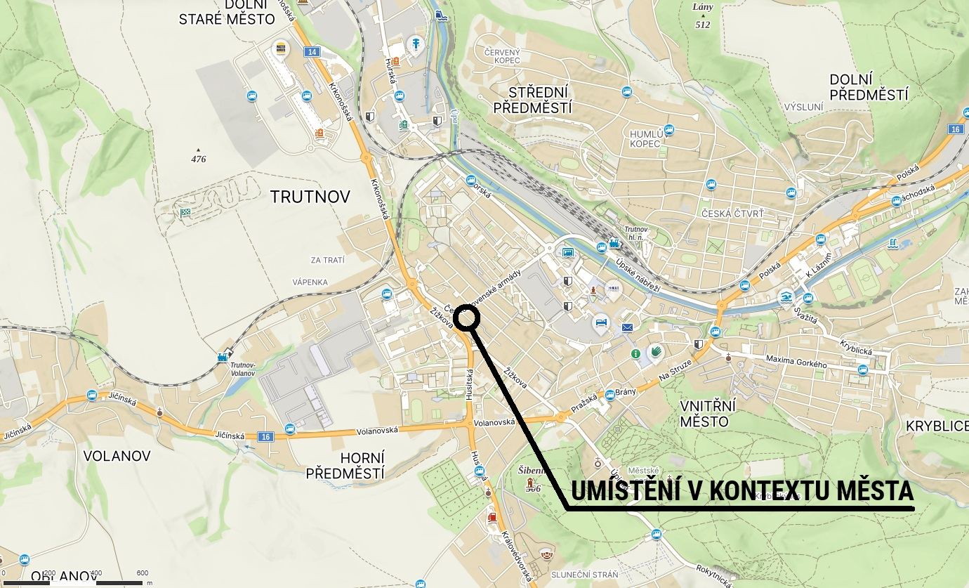Příjezd je zajištěn z pozemku ve vlastnictví města Trutnov. Areál garáží je přístupný z ulice Československé armády.